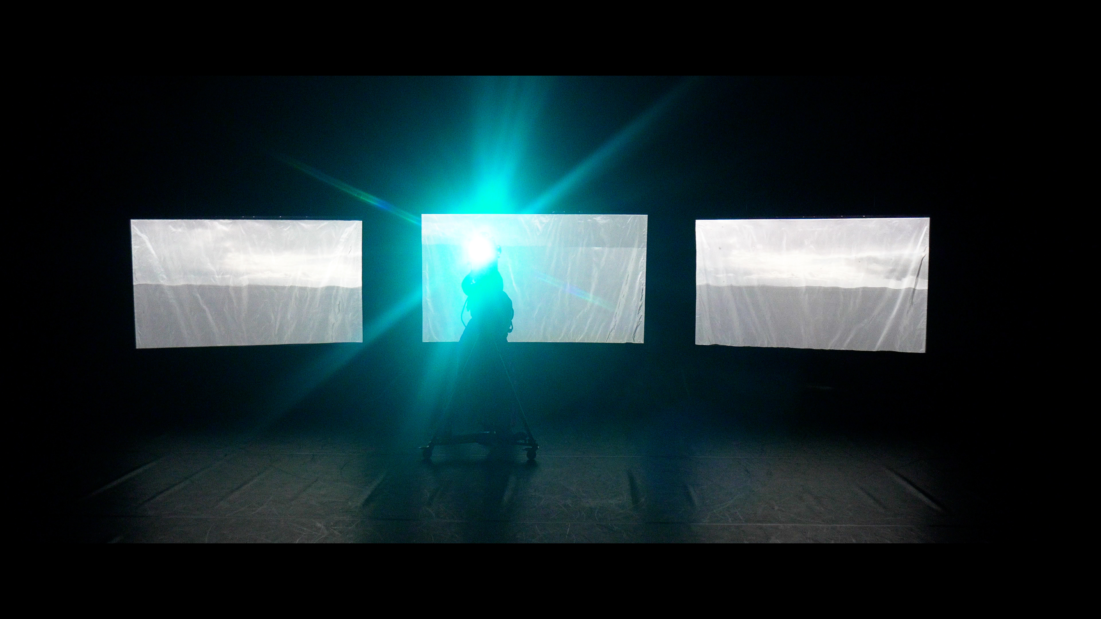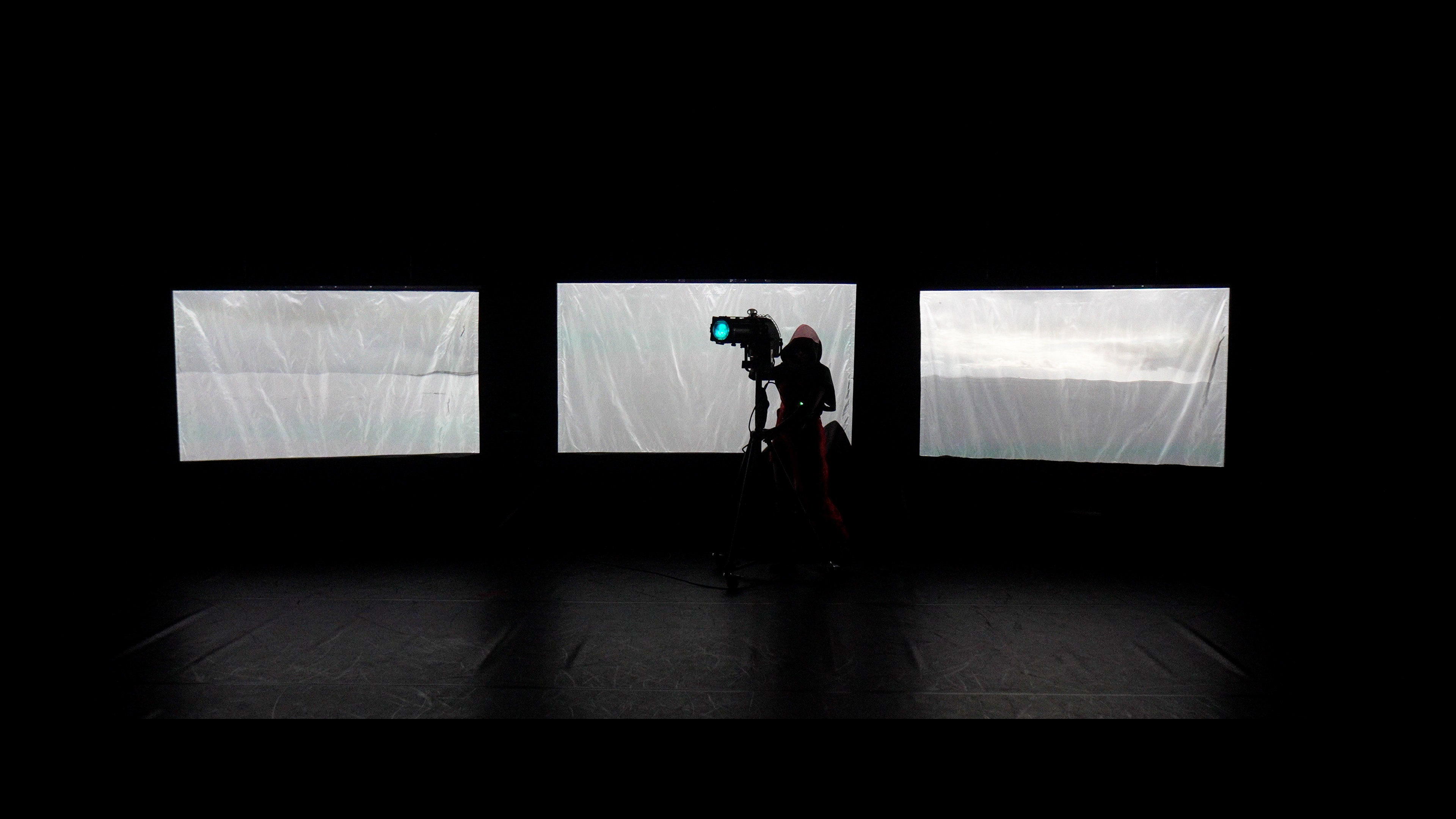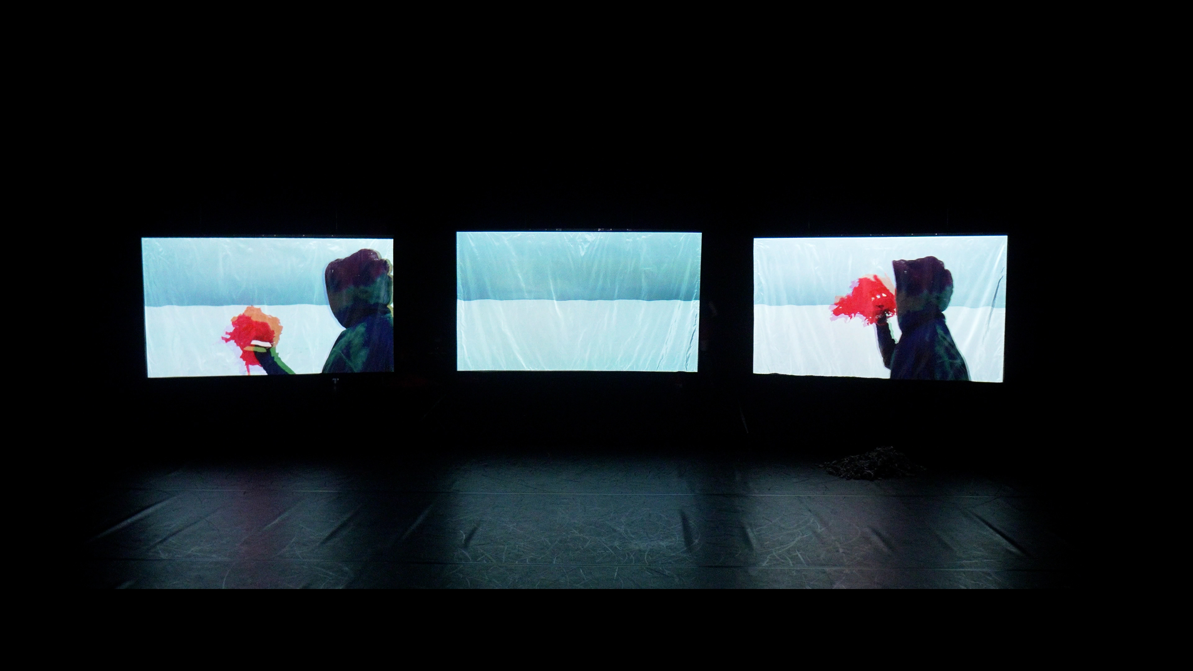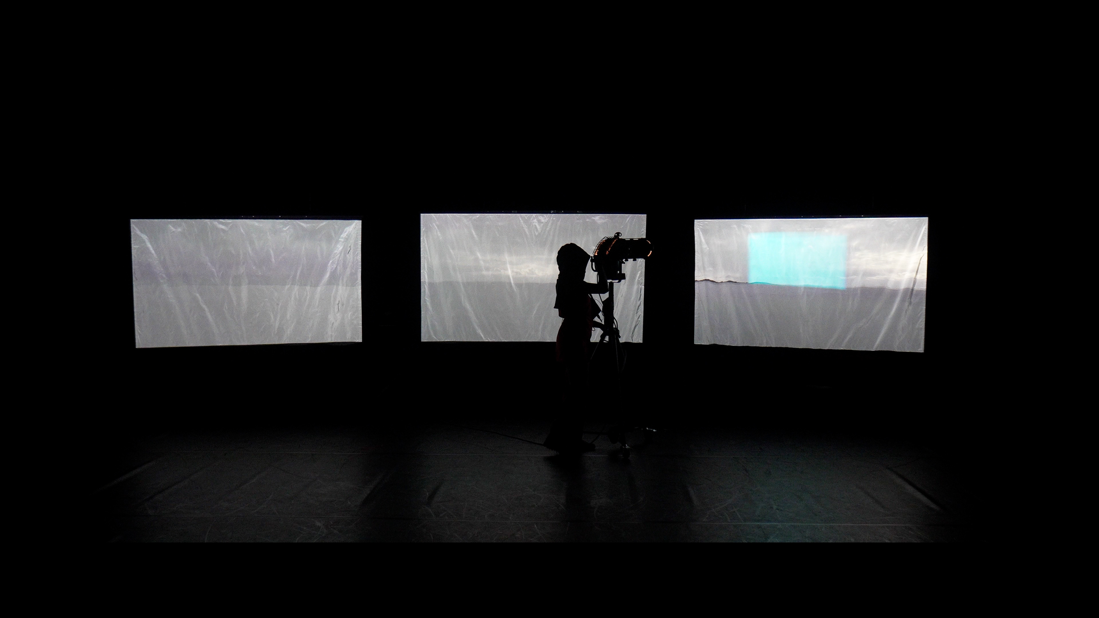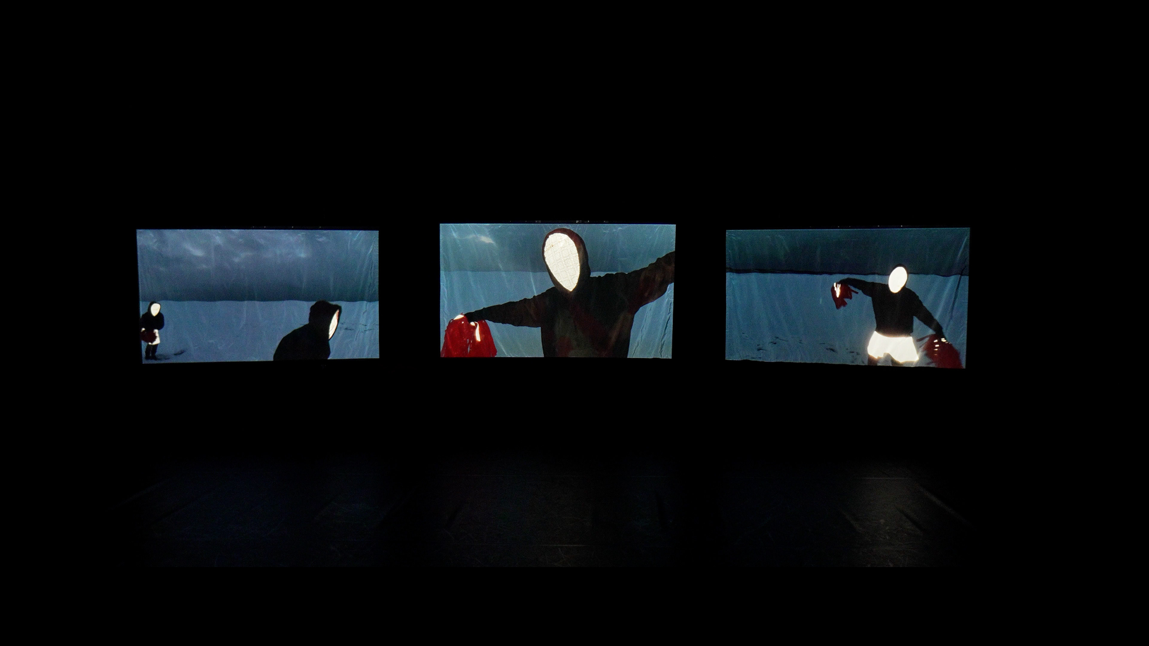 Projetadas em três ecrãs prateados, figuras mascaradas dançam numa praia desolada e coberta de neve. Situadas num futuro ambíguo e indefinido, os seus gestos espectrais — de cheerleading, de navegação e passos de ballet — surgem como vestígios de um mundo que chegou ao fim.