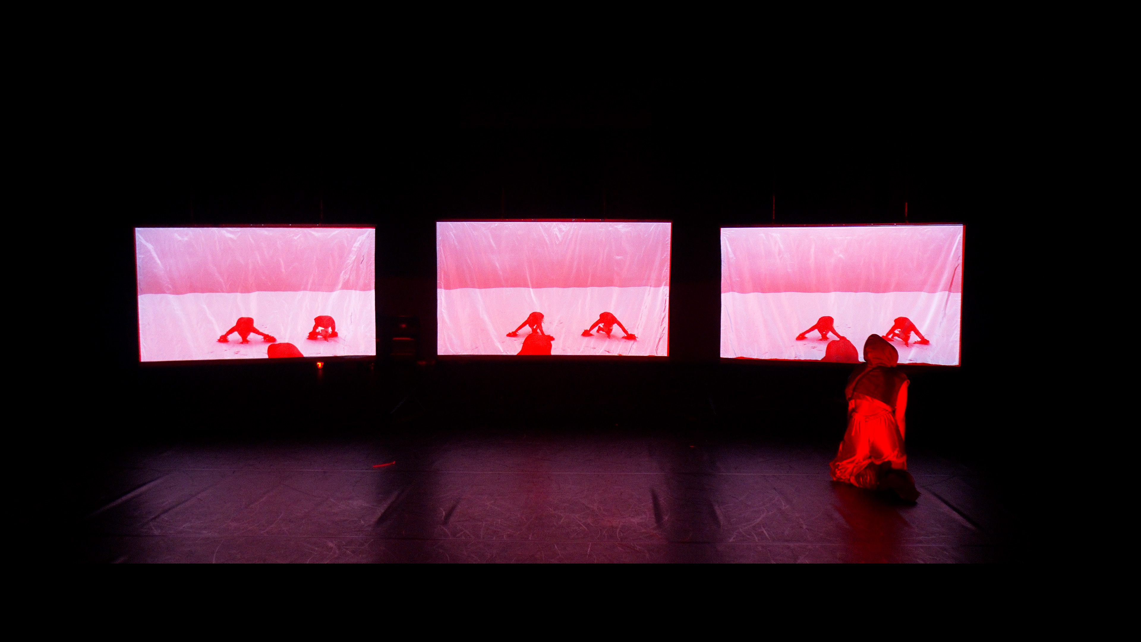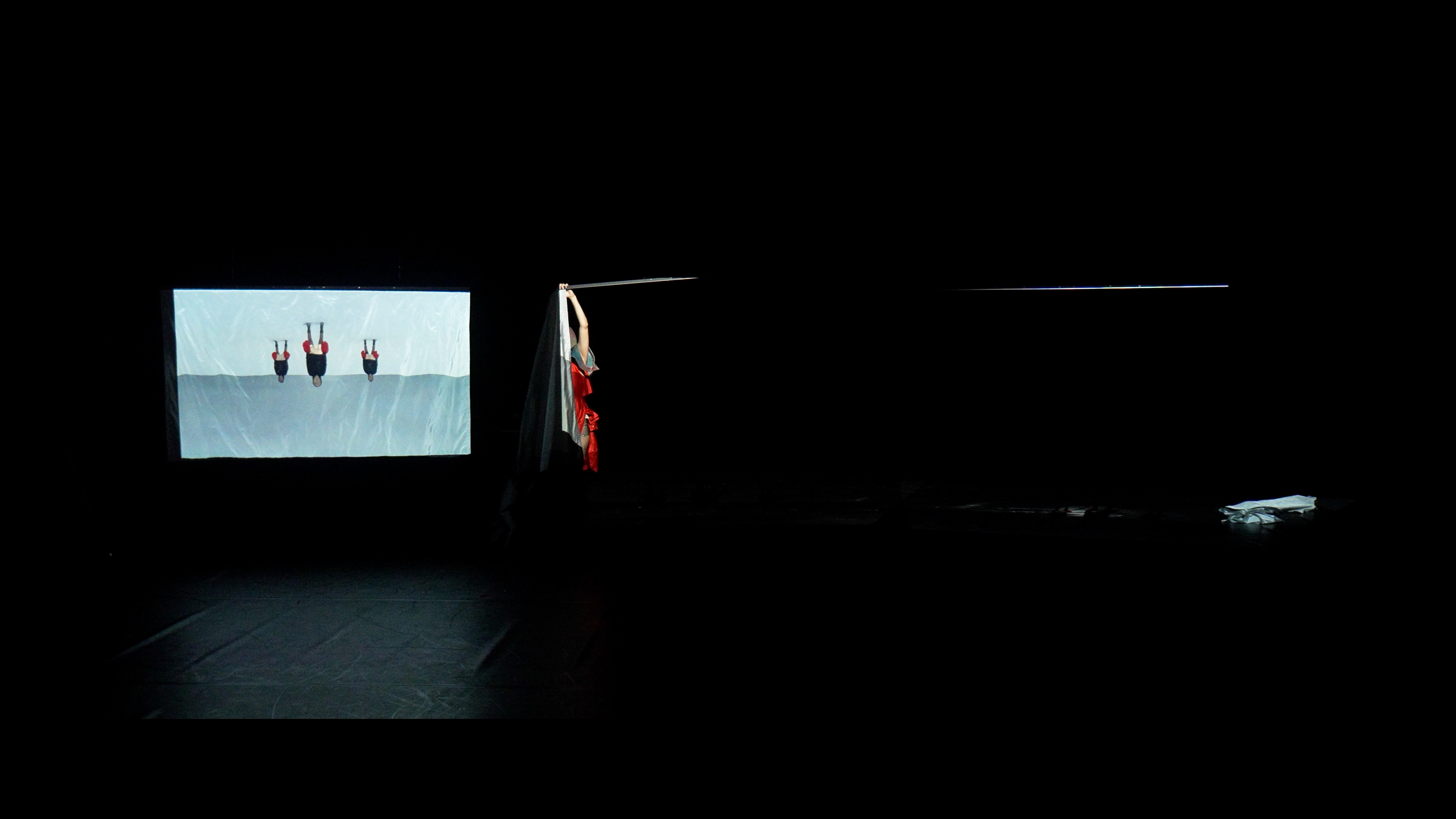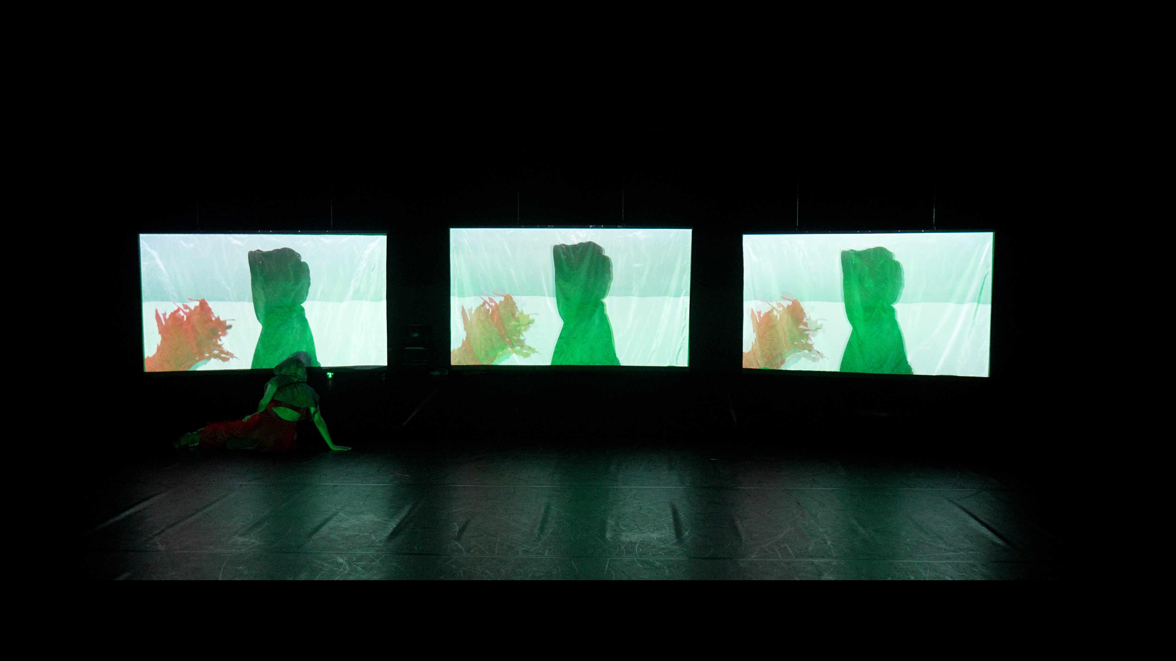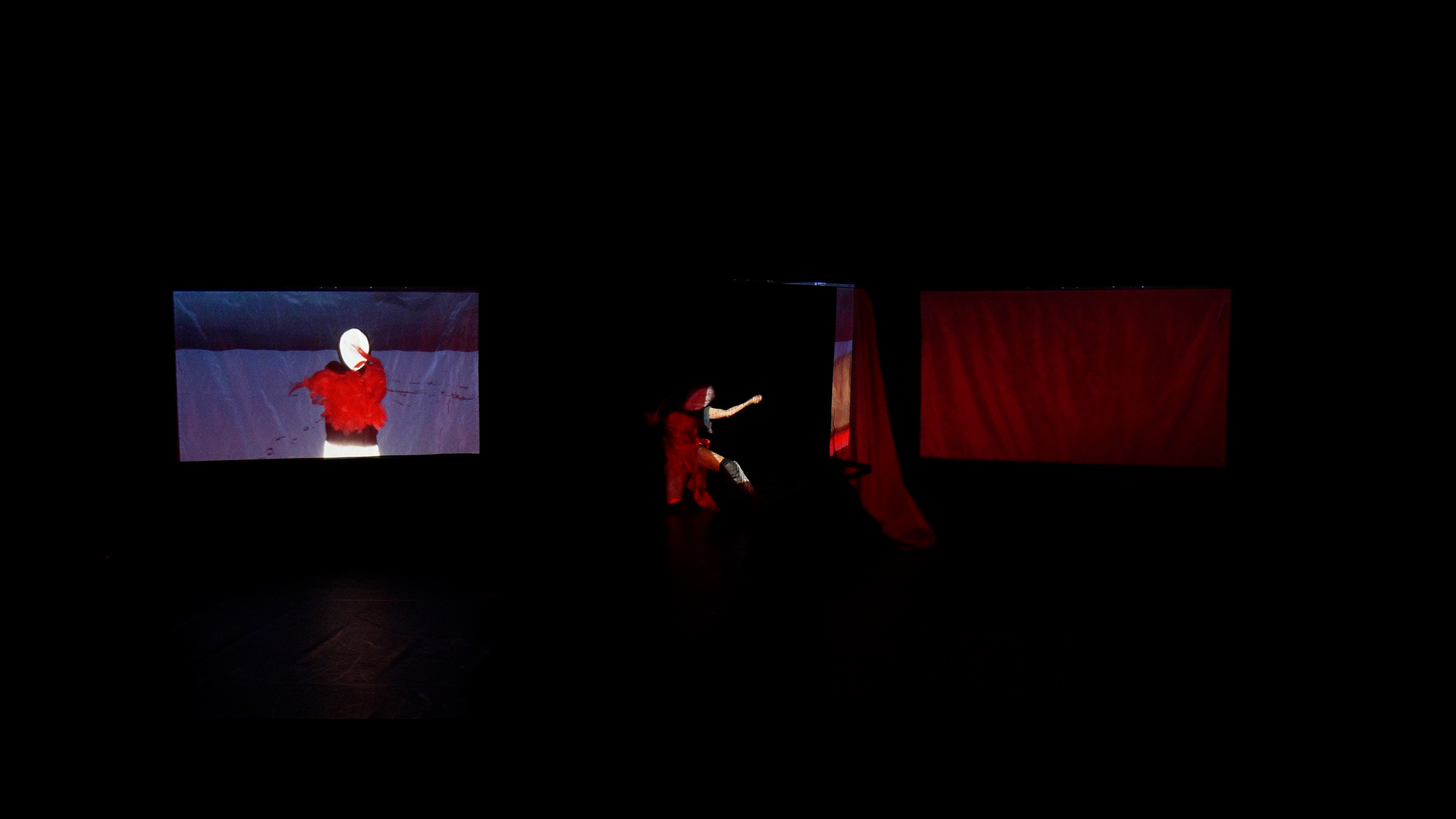 À medida que a dança se repete incessantemente no ecrã, outras forças emergem na escuridão do teatro.
